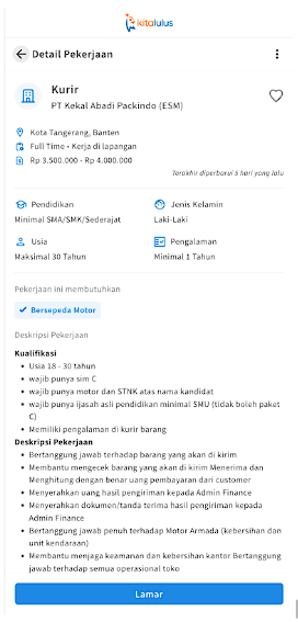 Tunggu apalagi? Yuk #WujudkanMimpi, segera instal aplikasi KitaLulus di handphone kamu! Buat akun dan lengkapi profil kamu sekarang juga. Dapatkan rekomendasi lowongan kerja menarik khusus untuk kamu. Lamar kerja dengan mudah, aman, dan terpercaya di mana pun kamu berada.